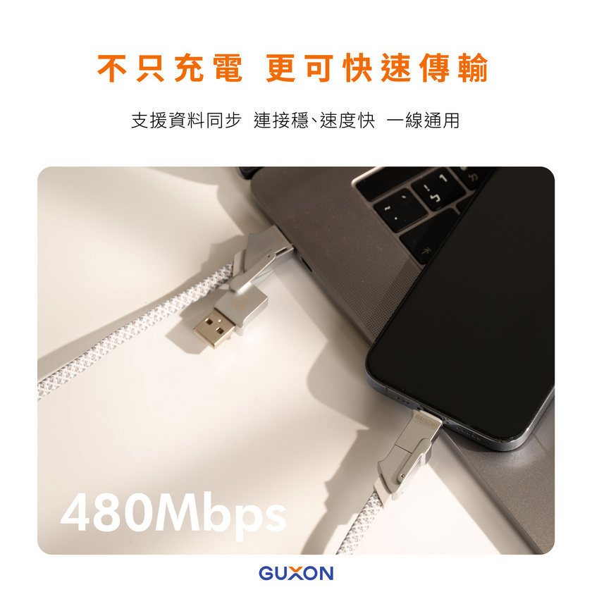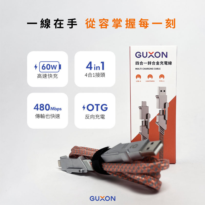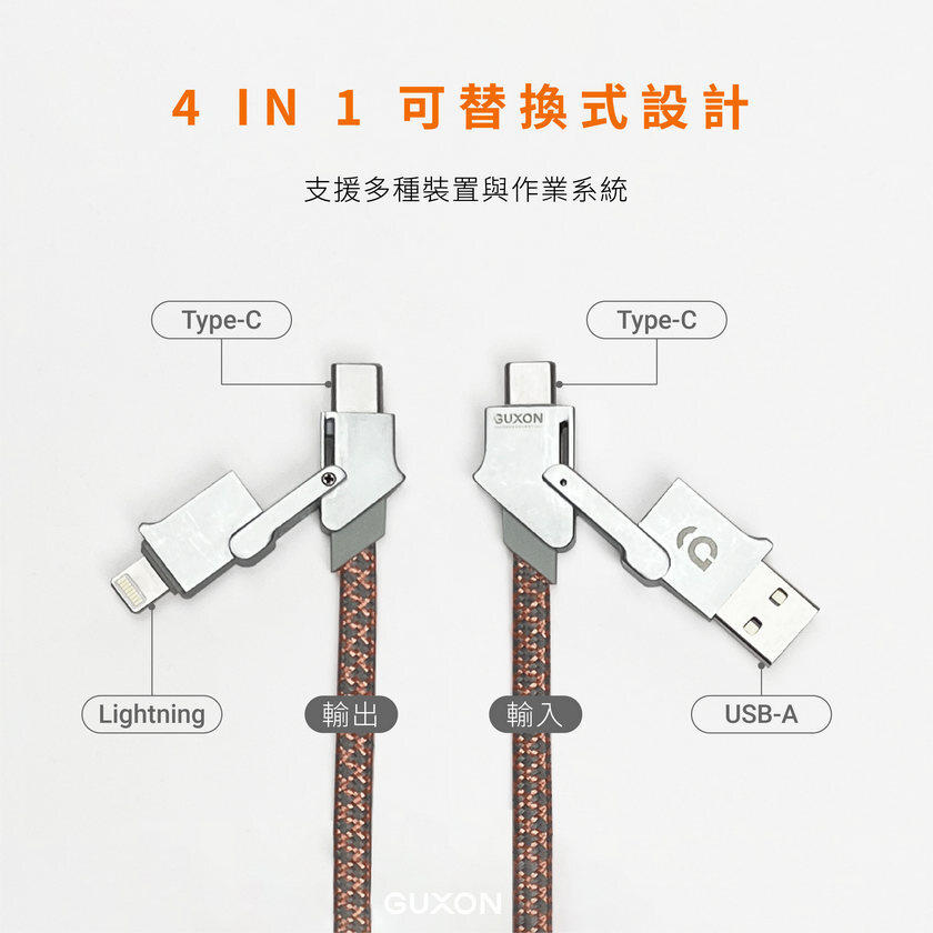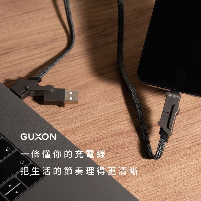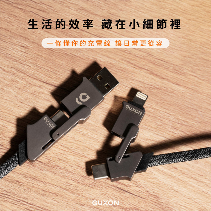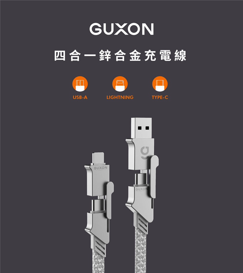 GUXON鋅合金四合一快充線,集成USB-A、Type-C、Lightning多介面設計。