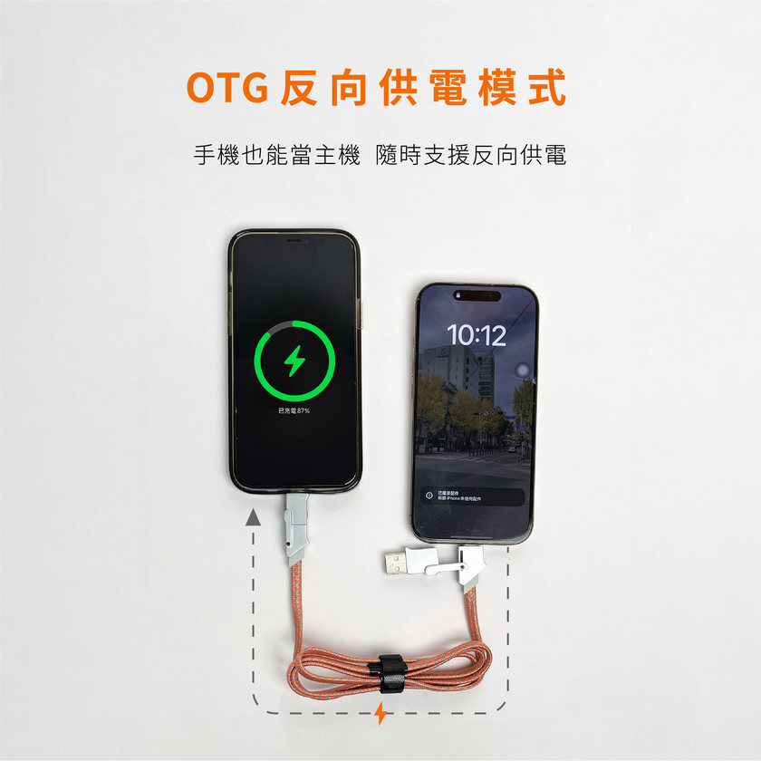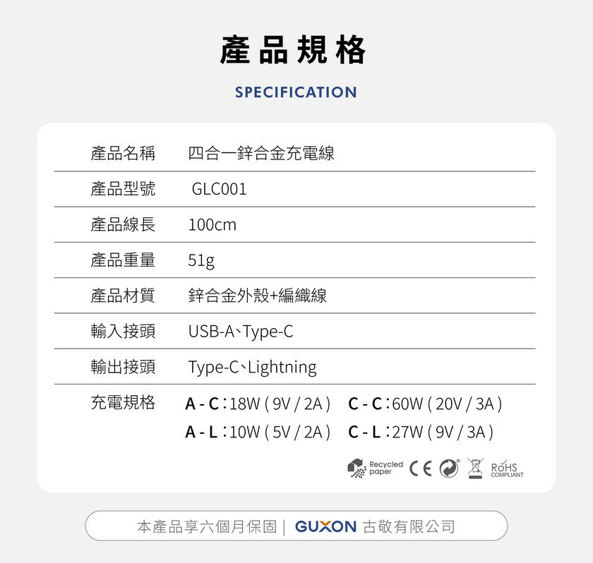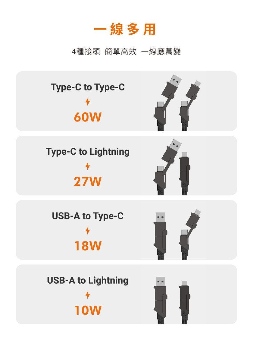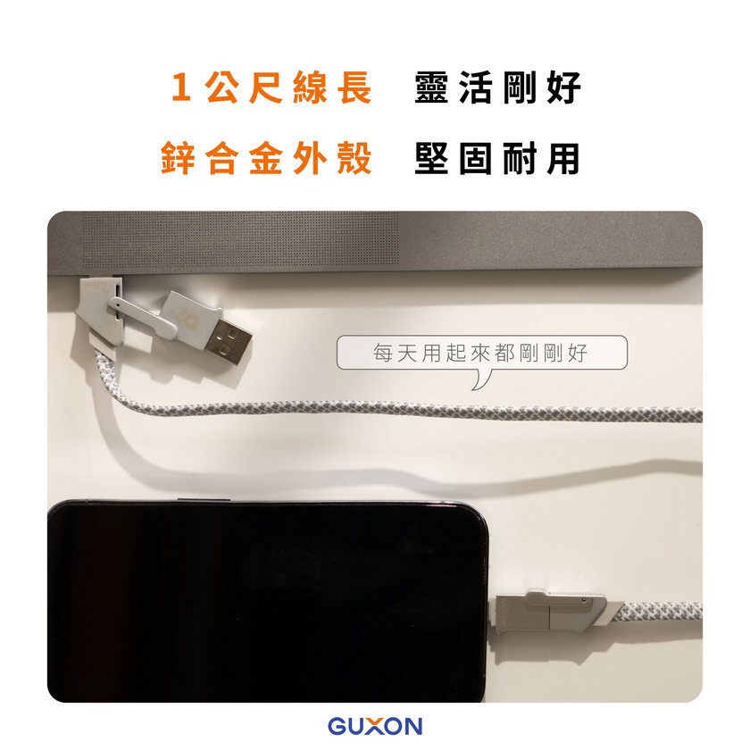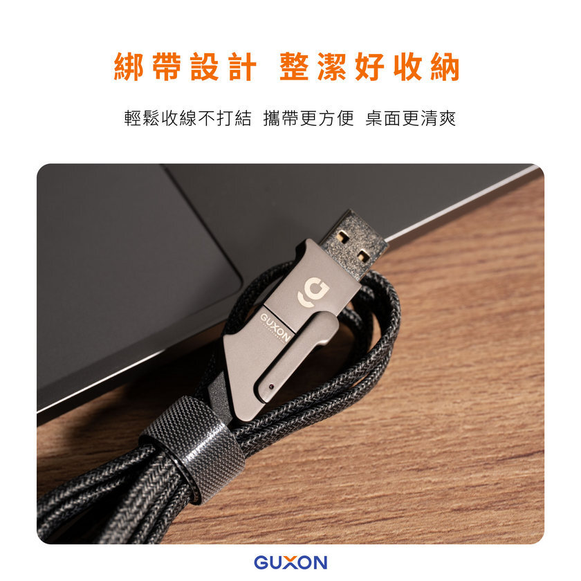 GUXON鋅合金四合一快充線,集成USB-A、Type-C、Lightning多介面設計。